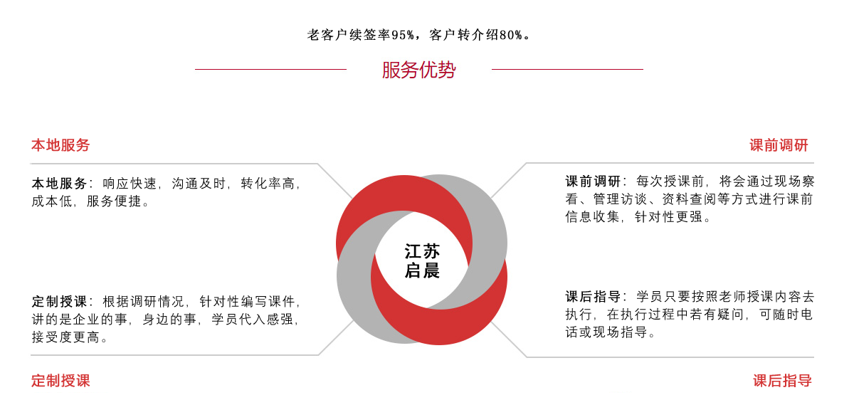 企業(yè)培訓(xùn)>首選>江蘇啟晨!制造業(yè)的理想選擇!江蘇啟晨企業(yè)管理咨詢有限公司位于風(fēng)景秀麗的江蘇省宿遷市。公司由國內(nèi)知名高校及全球500強企業(yè)內(nèi)頂尖的學(xué)者、教授、企業(yè)培訓(xùn)導(dǎo)師、企業(yè)顧問等共同打造的一家專業(yè)的管理咨詢與培訓(xùn)機構(gòu)。公司專注于企業(yè)生產(chǎn)管理、現(xiàn)場管理、質(zhì)量管理、安全管理、市場與銷售、人力資源管理、財務(wù)管理、班組管理、員工管理、內(nèi)訓(xùn)?�